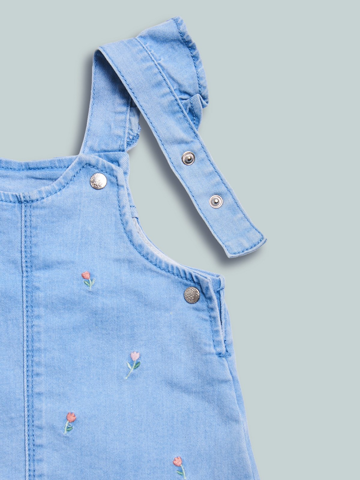 Salopette gonna in morbido denim elasticizzato, bretelle regolabili e apertura sui fianchi con bottoni a pressione. Fiorellini colorati ricamati. La rouches dona un tocco di vivacitร . Un capo sfizioso, ideale da abbinare alle tshirt della collezione.