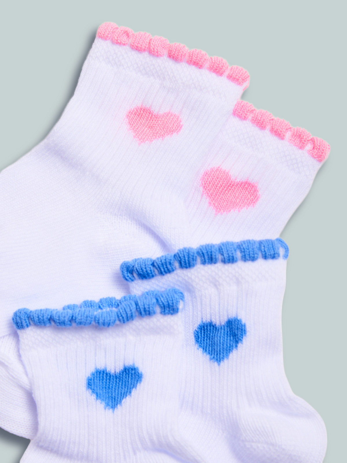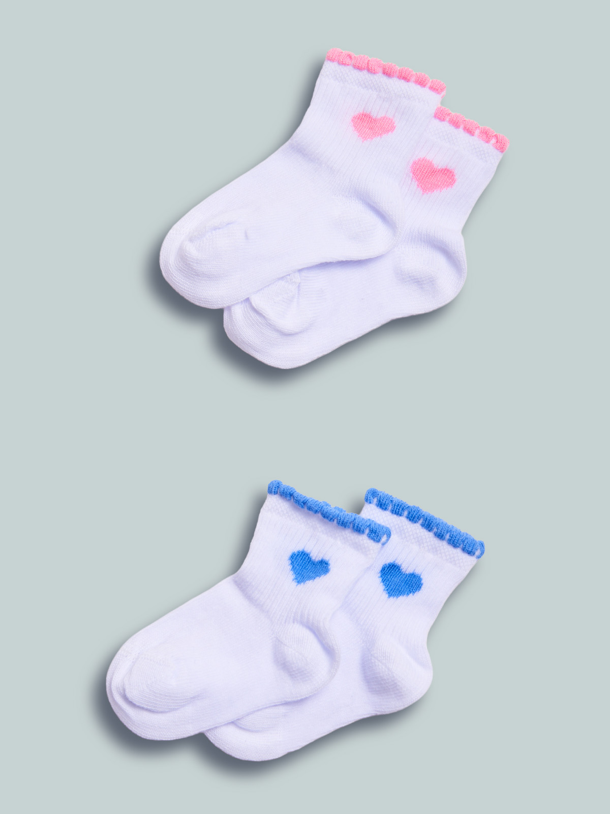 Calzini lunghezza sopra caviglia in morbido misto cotone. Doppia variante colore: bianco con cuore e ondine rosa, l’altro bianco con cuore e ondine azzurro. In un unico acquisto avrete due proposte molto pratiche e alla moda!