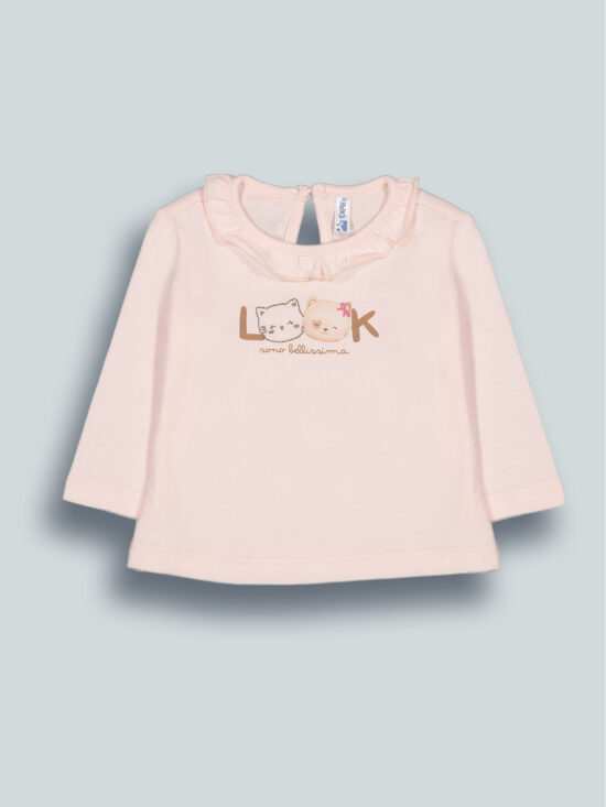 Tshirt in caldo cotone manica lunga, apertura a goccia e bottone sul dietro. Tenera scritta ricamata e stampata. Girocollo rifinito con rouches. Una tshirt con dettagli sfiziosi che non puรฒ mancare nell’armadio della vostra neonata.