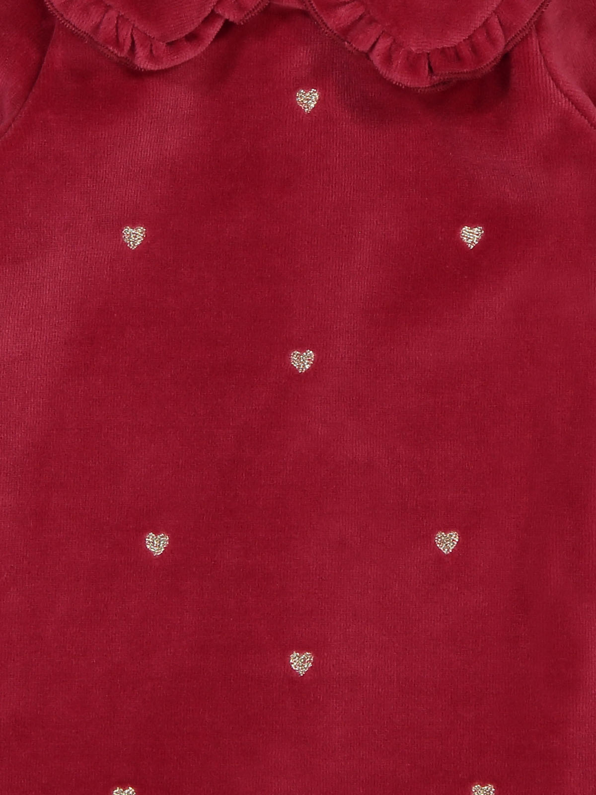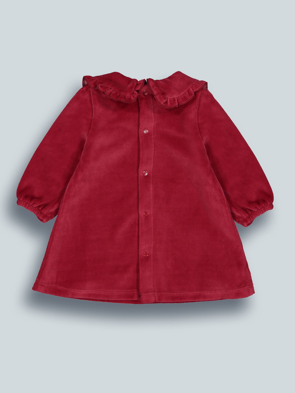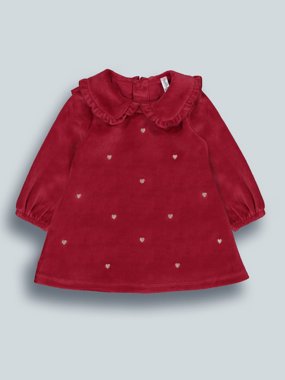 Elegante vestito in ciniglia, la vestibilitร  รจ morbida e pratica grazie all’apertura totale sul dietro con bottoni. Collo rotondo rifinito da rouches. Delicato ricamo cuori con filo lurex. L’abito da neonata ideale per le festivitร  natalizie.