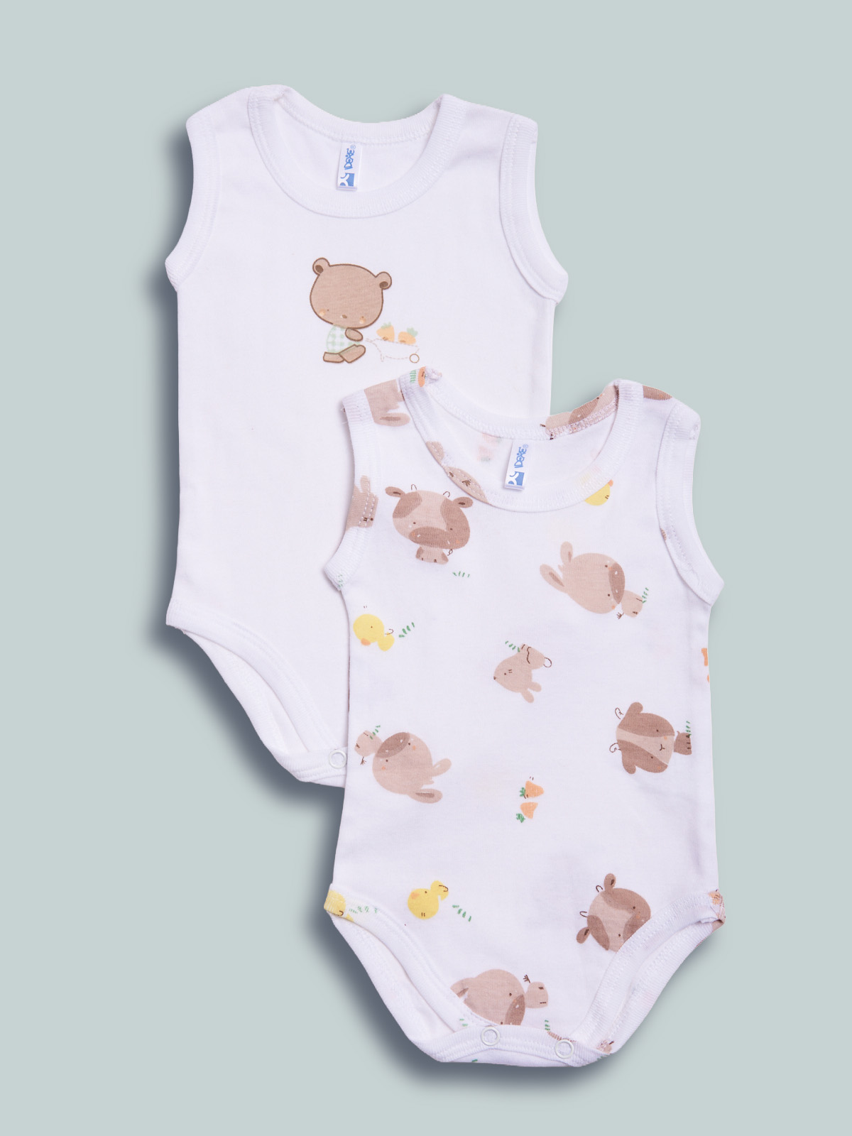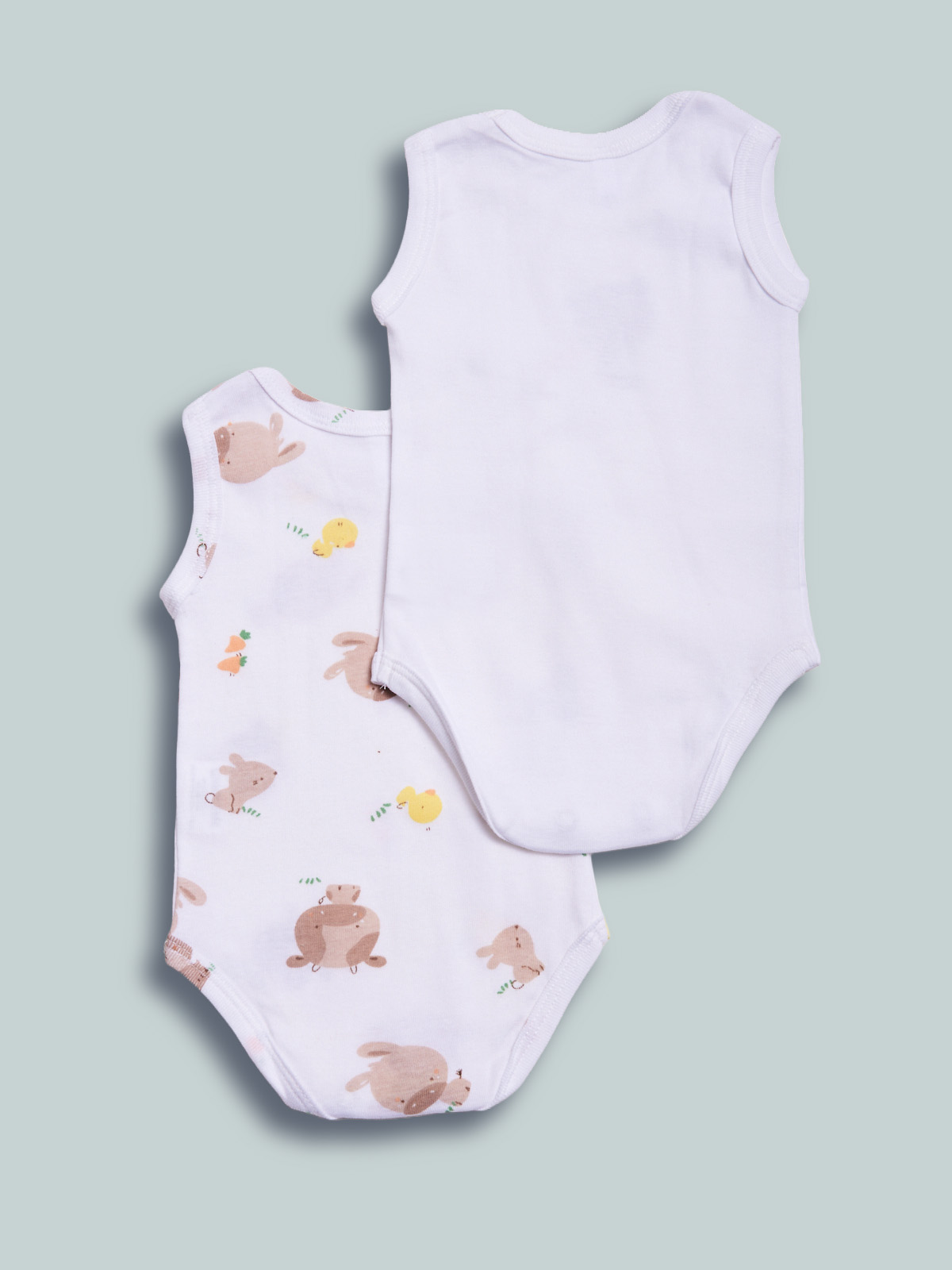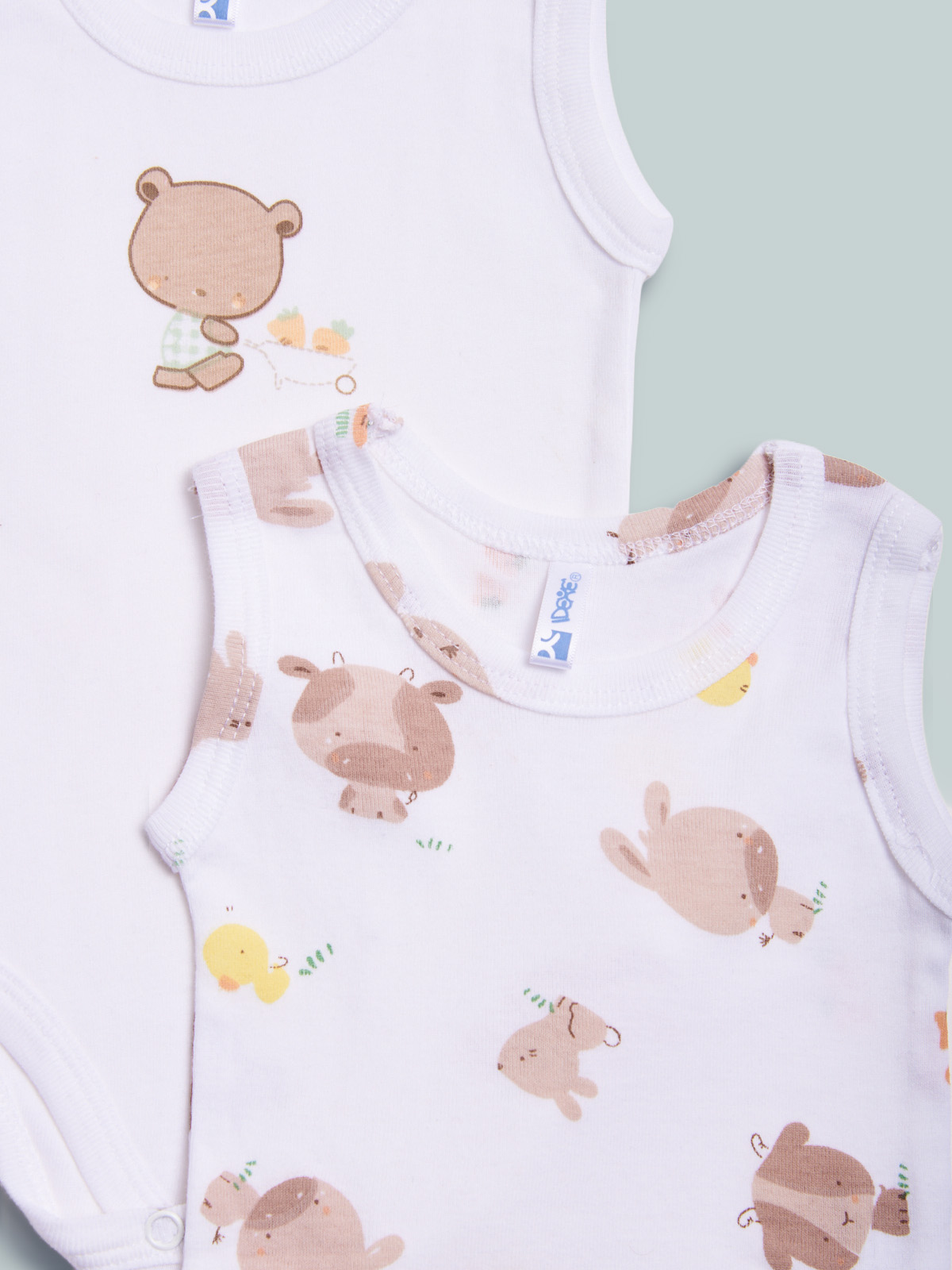 Set composto da due body in costina di cotone smanicato, fantasia e unito sui toni neutri.