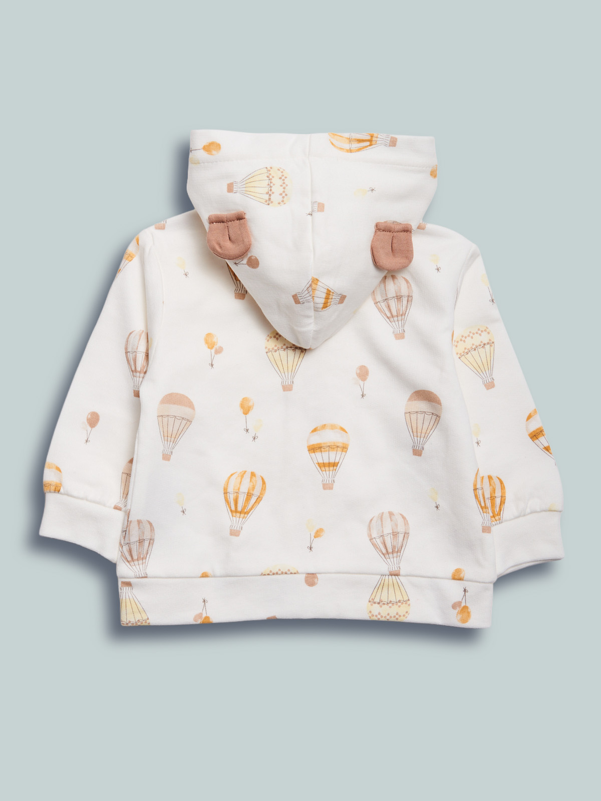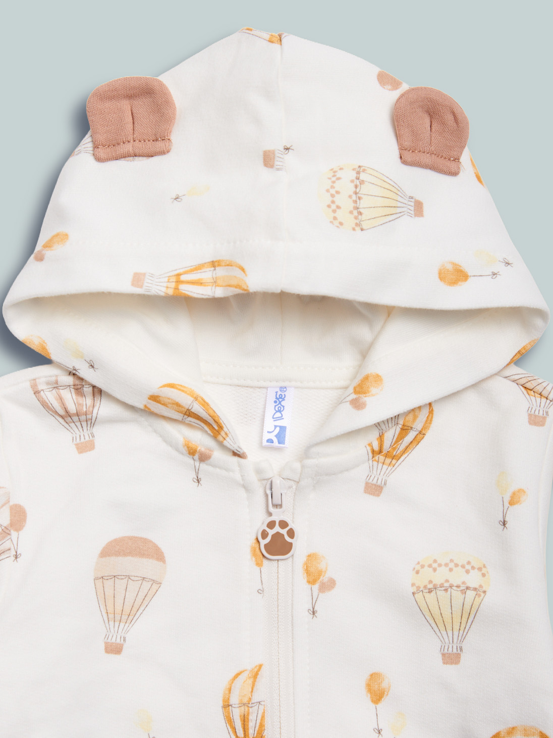 Cardigan in felpa leggera stampata fantasia, cappuccio con orecchie 3D. Pratica apertura con zip e cursore personalizzato. Un capo pratico e comodo, adatto per il tempo libero.
