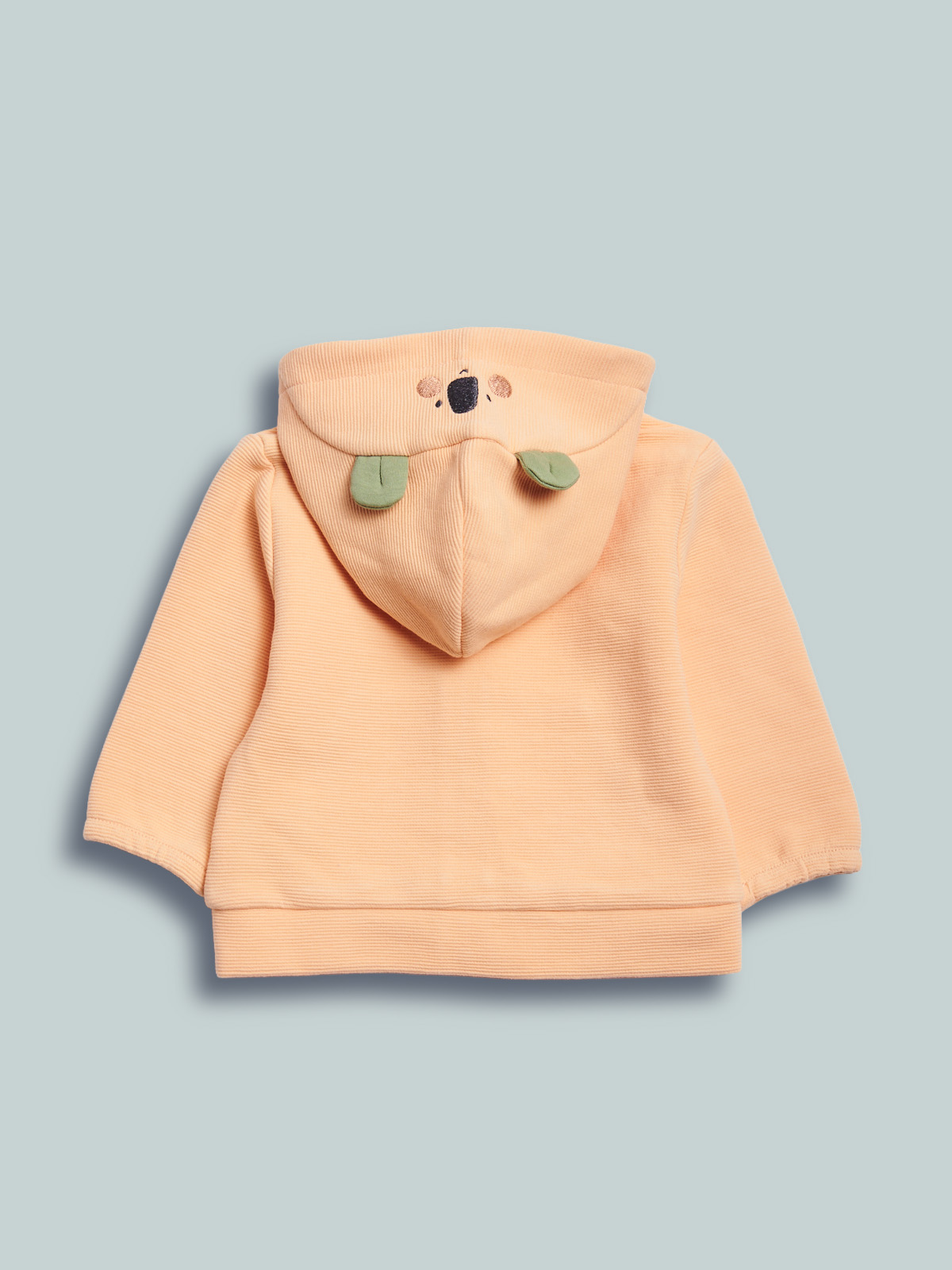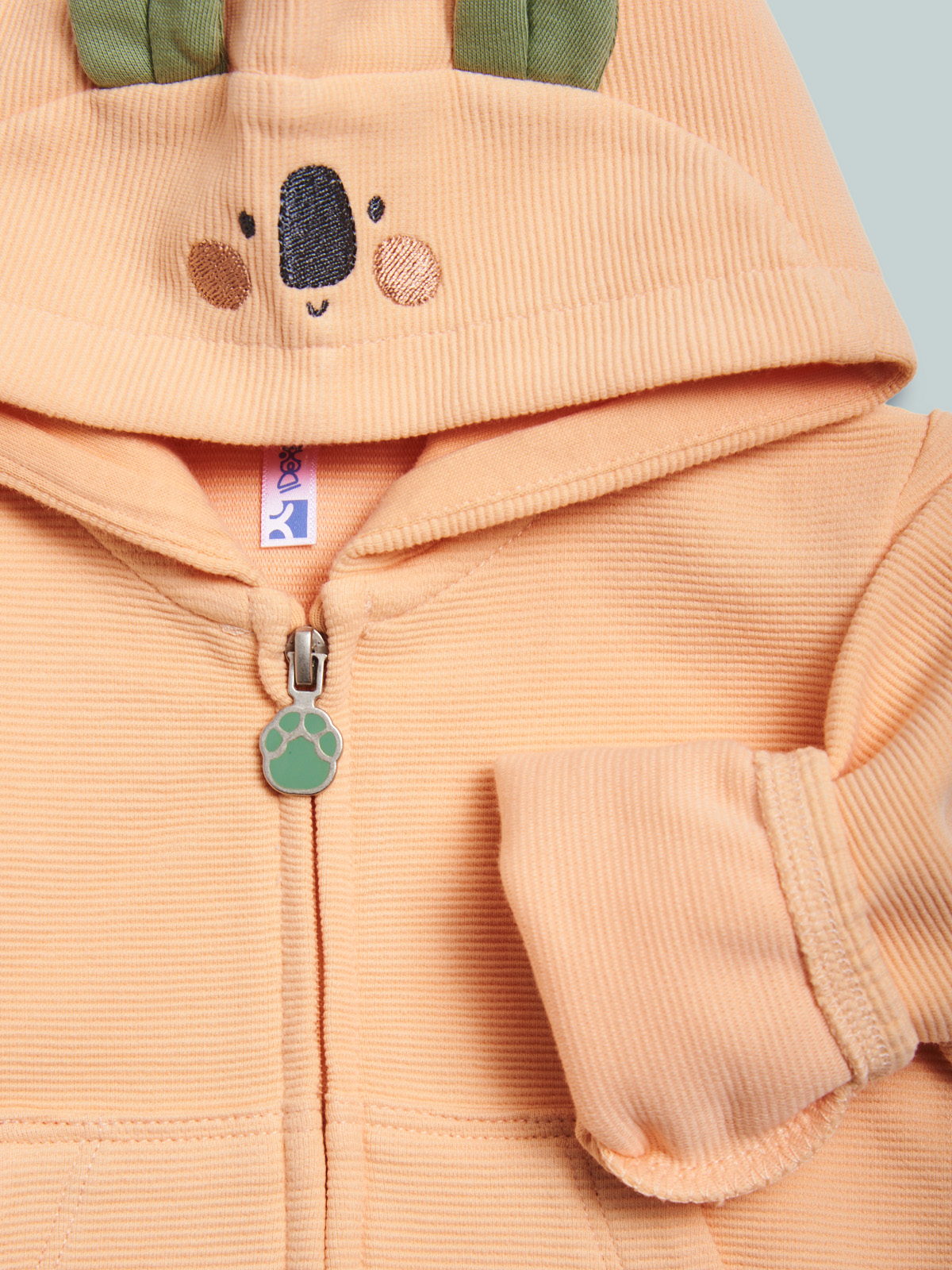 Cardigan in morbido tubico riga a rilievo, manica lunga. Dotata di cappuccio con musetto ricamato e simpatiche orecchiette 3D. Comoda apertura con zip. Confortevole, versatile e spiritoso.