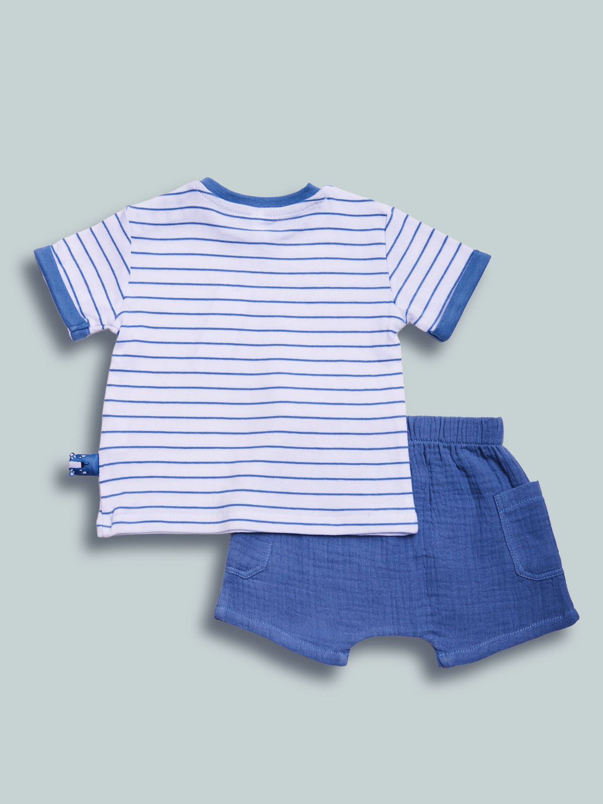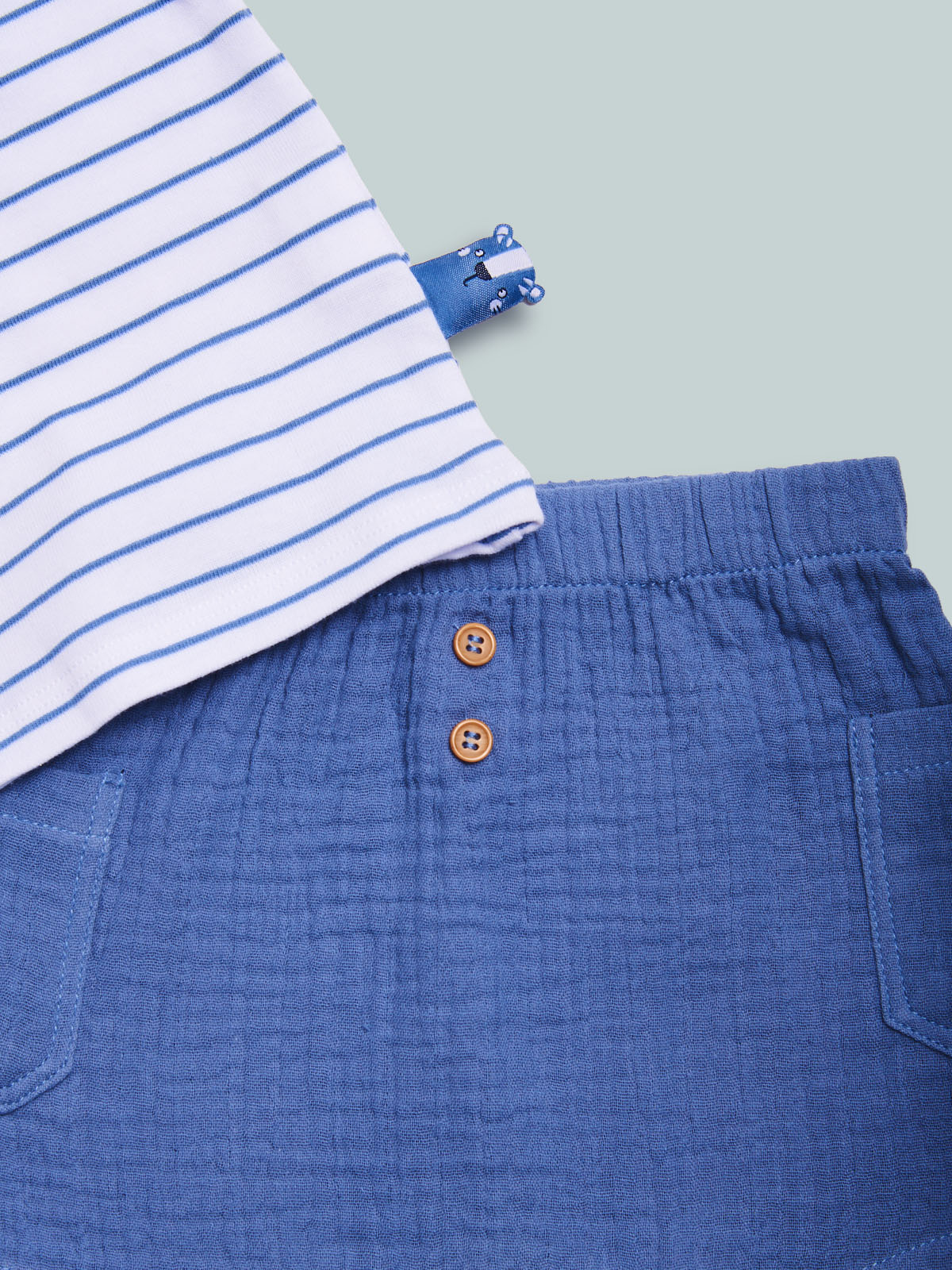 Completo due pezzi. Tshirt cotone rigato, manica corta con risvolto contrasto, apertura su spalla con bottoncini a pressione. Etichetta imbottita su fianco. Short in mussola goffrata, bottoni effetto legno decorativi. Tasche funzionali sui fianchi. Ideale da indossare in qualsiasi occasione.