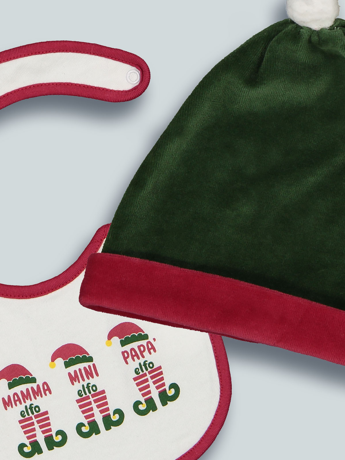 Completo composto da cappellino in soffice ciniglia e bavetta in morbido cotone da indossare la notte di Natale, da abbinare alla tutina natalizia.