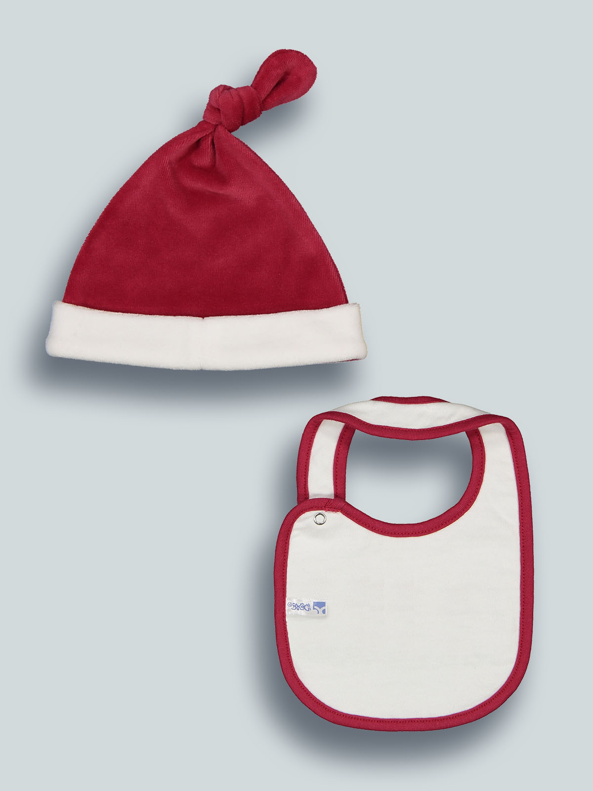 Completo composto da cappellino in soffice ciniglia e bavetta in morbido cotone da indossare la notte di Natale, da abbinare alla tutina natalizia.