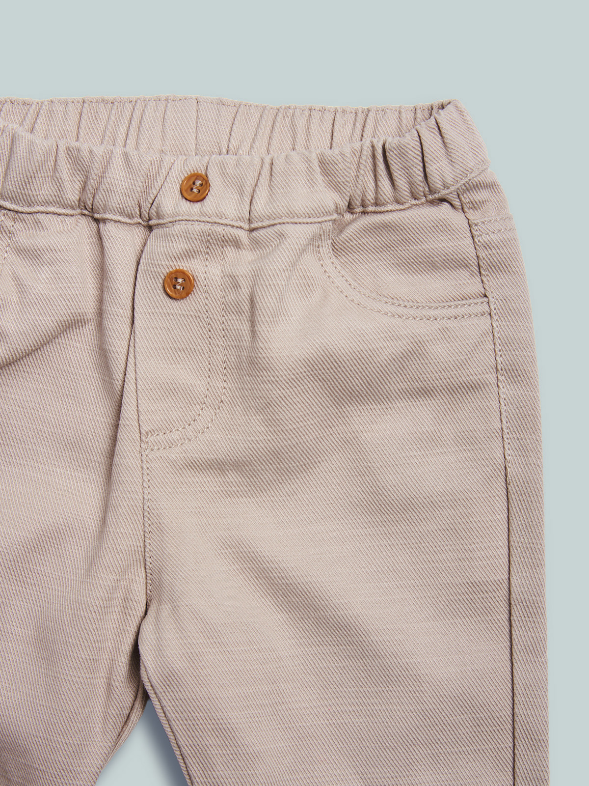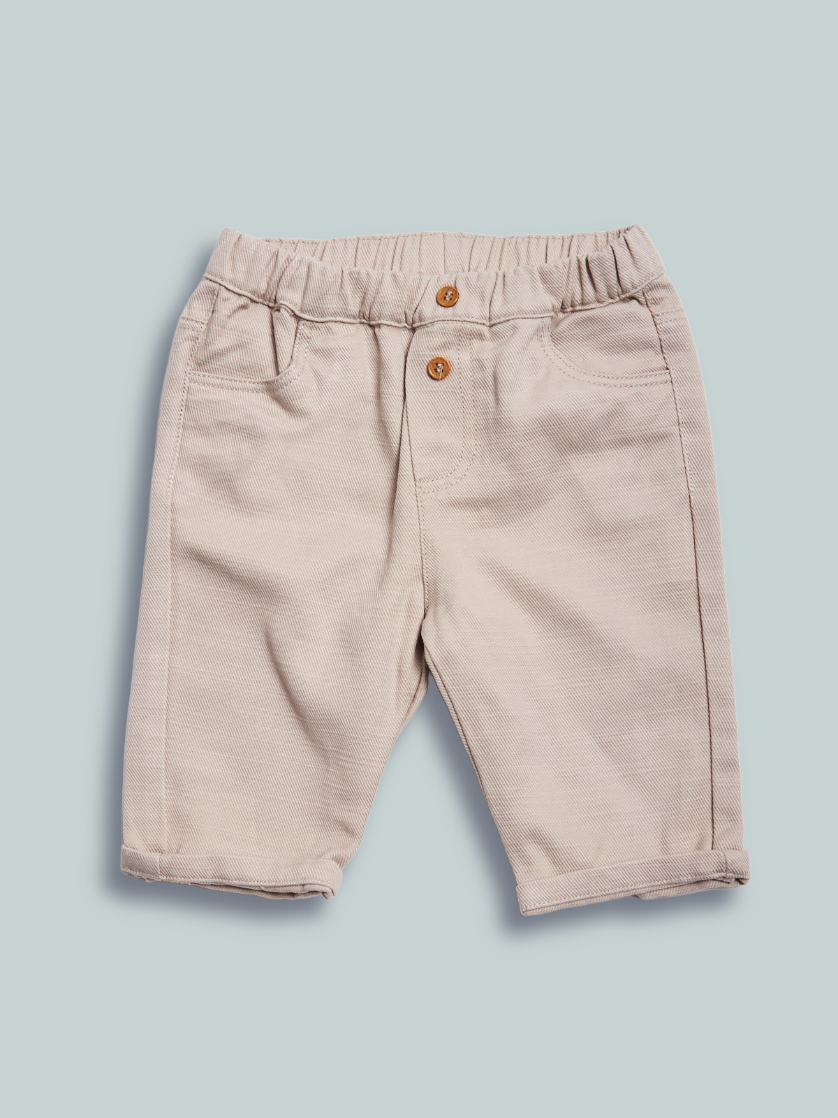 Pantaloni in morbido tencel, vita elasticata con bottoni effetto legno decorativi, tasche funzionali. Indossato con risvolto per un look piรน moderno.