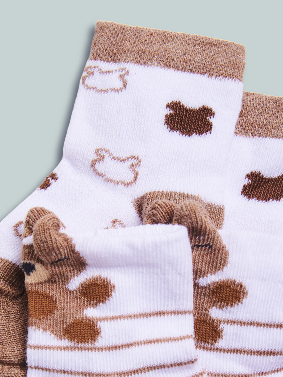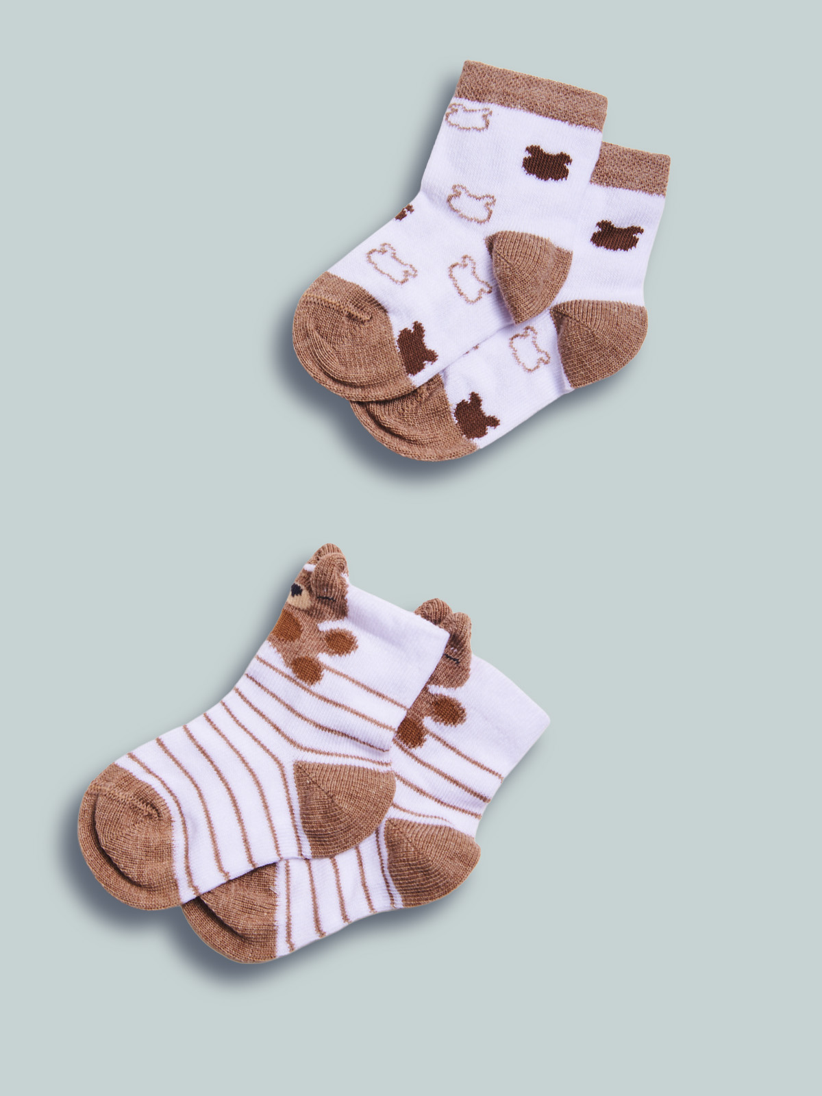 Calzini lunghezza sopra caviglia in morbido misto cotone. Doppia variante colore: uno bianco con fantasia orsetti, l’altro rigato con orsetto e orecchie 3D. In un unico acquisto avrete due proposte molto pratiche e alla moda!