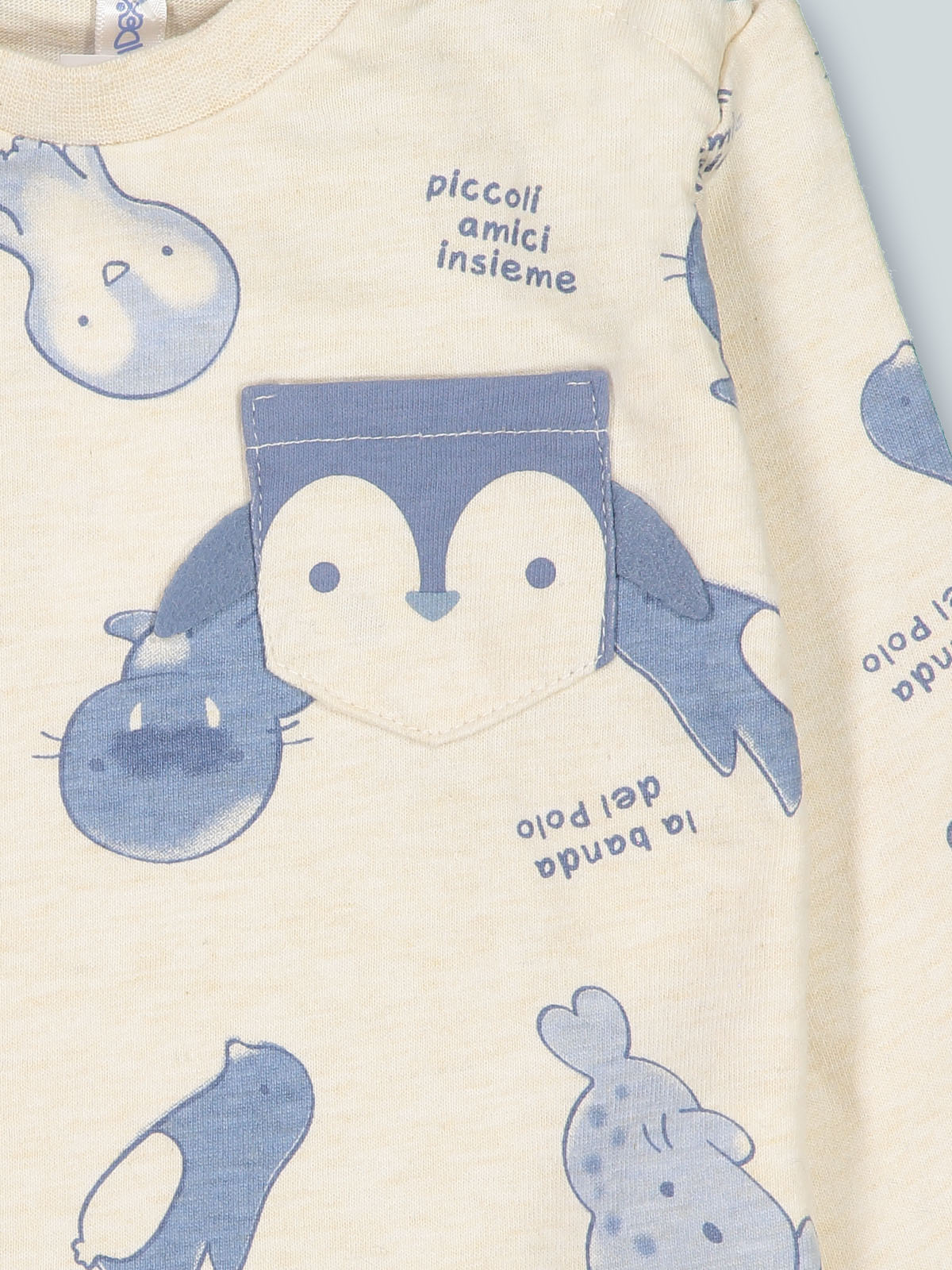 Tshirt in caldo cotone stampato su base beige melange, apertura su spalla con pratici bottoncini a pressione. Tasca su petto con simpatica stampa e ali 3D. Un capo pratico e confortevole per il tempo libero.